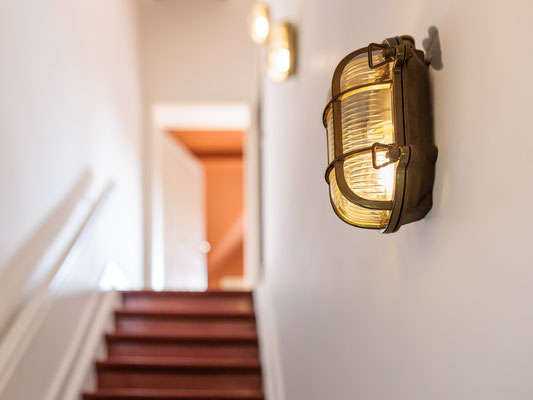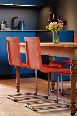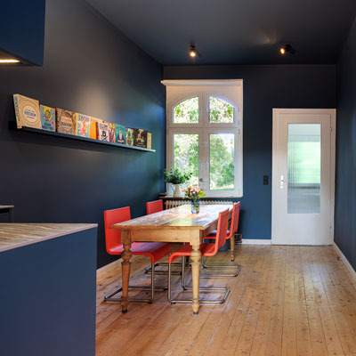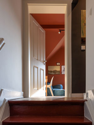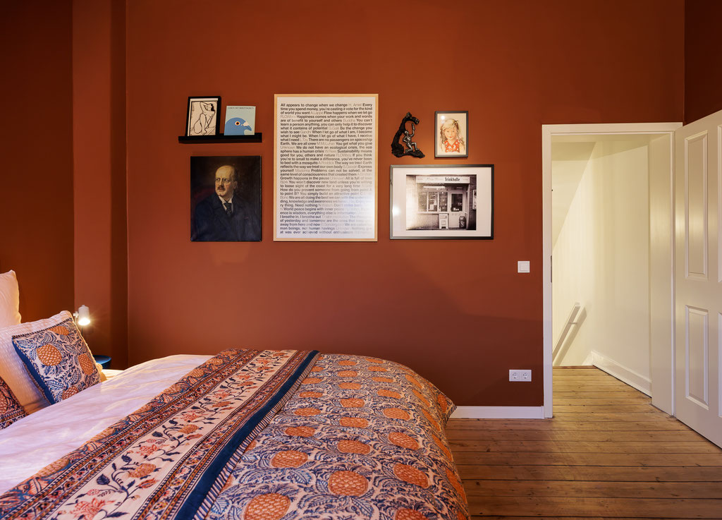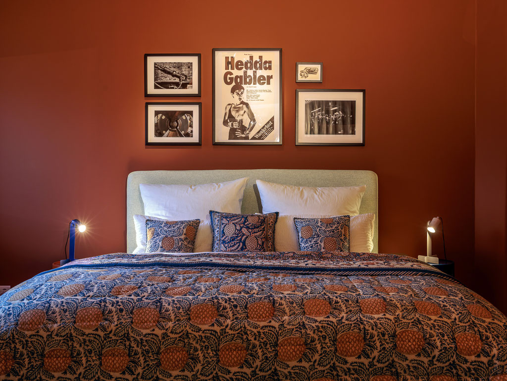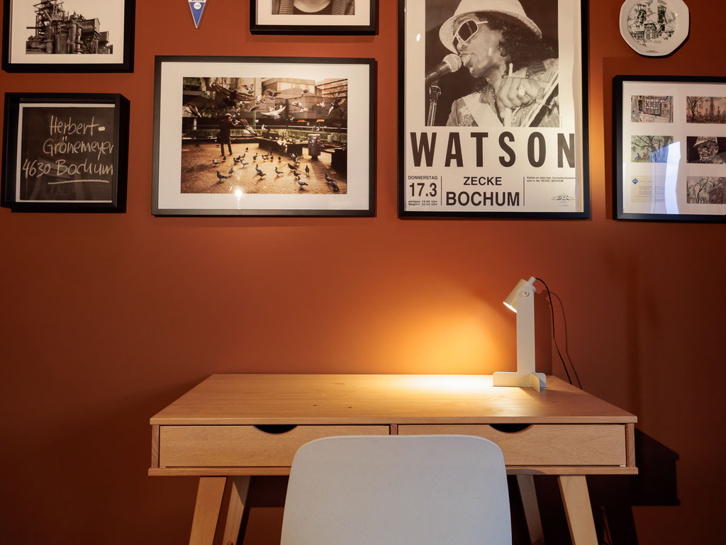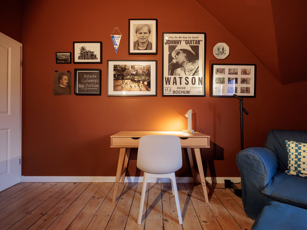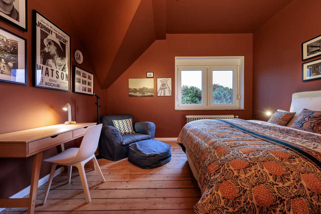 „Muscovado“ ist der Begriff für braunen Rohrzucker und der Name die spektakulären braunroten Wand- und Deckenfarbe des Schlafzimmers (wie alle anderen Farben im Haus von Little Greene). Sie verträgt sich besonders gut mit der Tagesdecke und den Kissen aus Südfrankreich und dem bequemen blauen Sessel. Antiquarische Fundstücke, Originalfotos und Veranstaltungsplakate erzählen von der Industriekultur des Ruhrgebiets und von den kulturellen Highlights der Stadt Bochum, von Grönemeyer bis zum legendären Schauspielhaus.