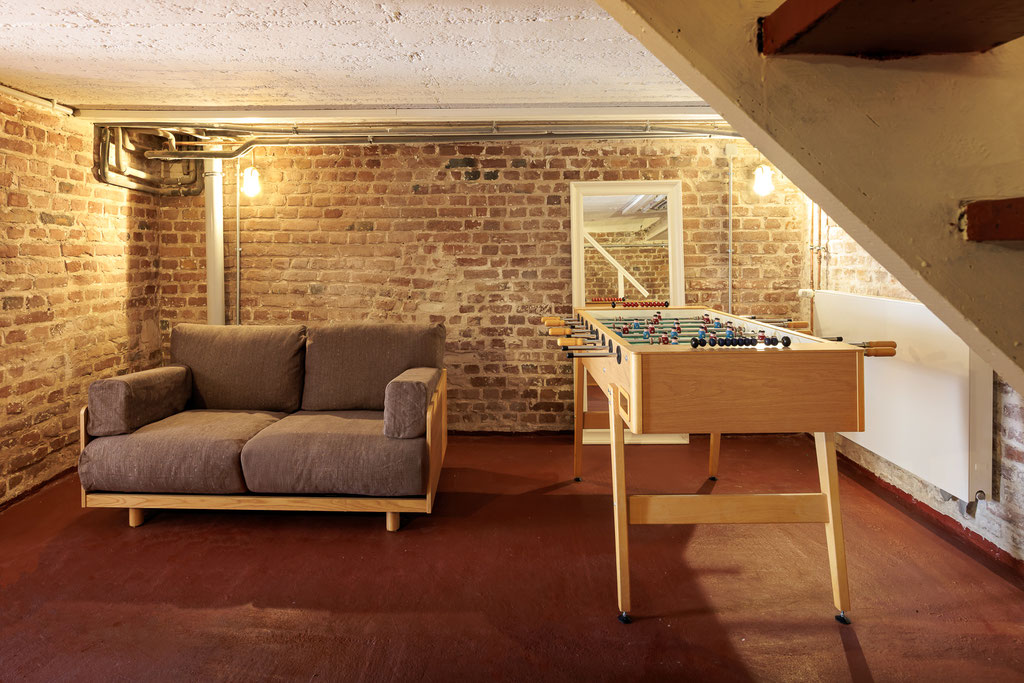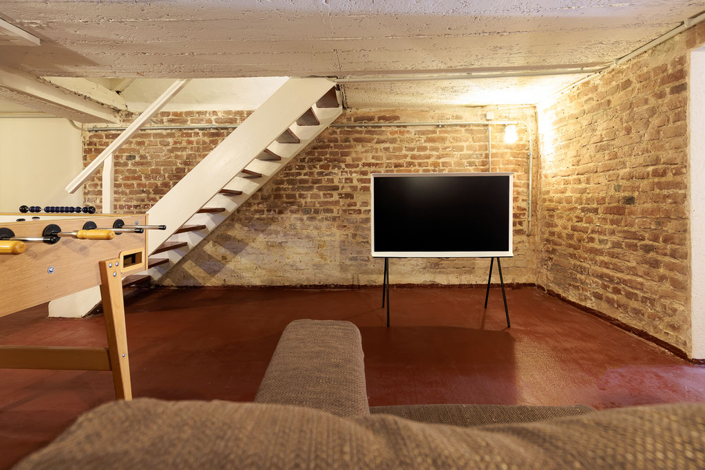 Im Untergeschoss haben wir einen kleinen "Entertainment-Bereich" mit großem Smart TV, Sofa und Kicker eingerichtet.