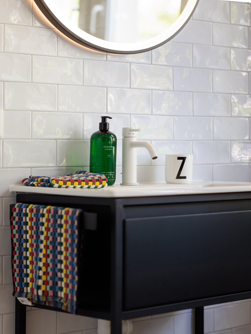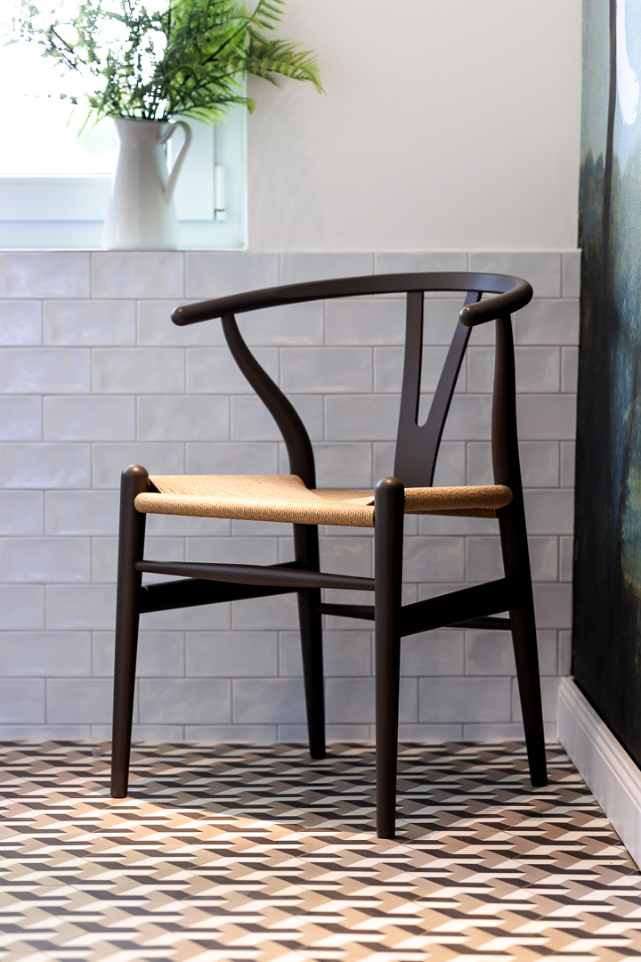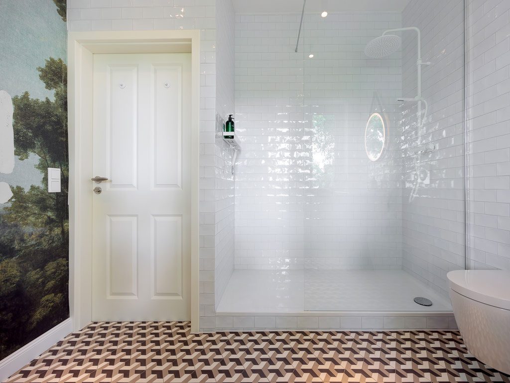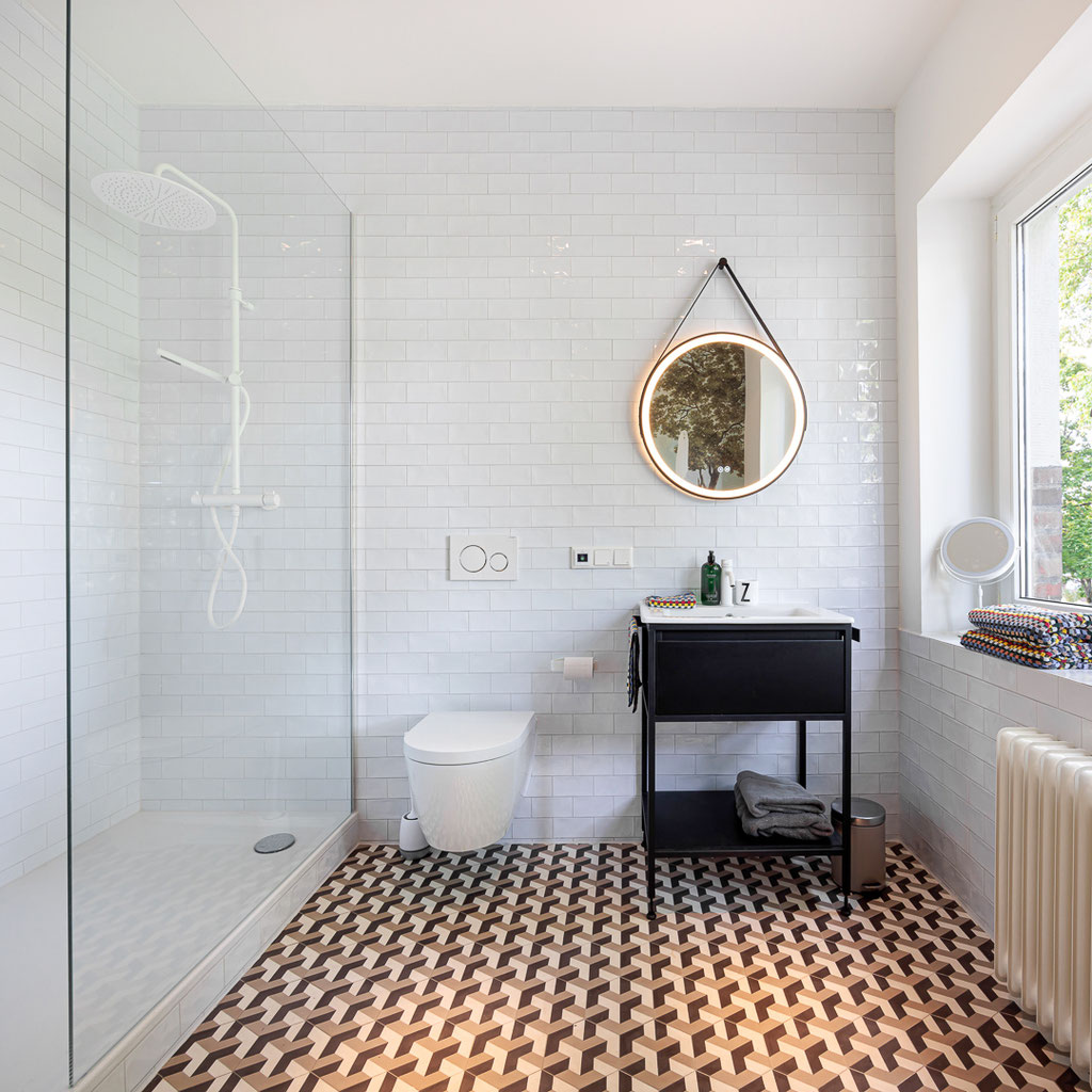 Wir haben ein neues großes Bad mit Dusche im Obergeschoss eingerichtet. Die weißen Wandfliesen haben wir mit Zementfliesen von VIA kombiniert und zusätzlich zu den Vintage-Heizkörpern eine komfortable Fußbodenheizung eingebaut.