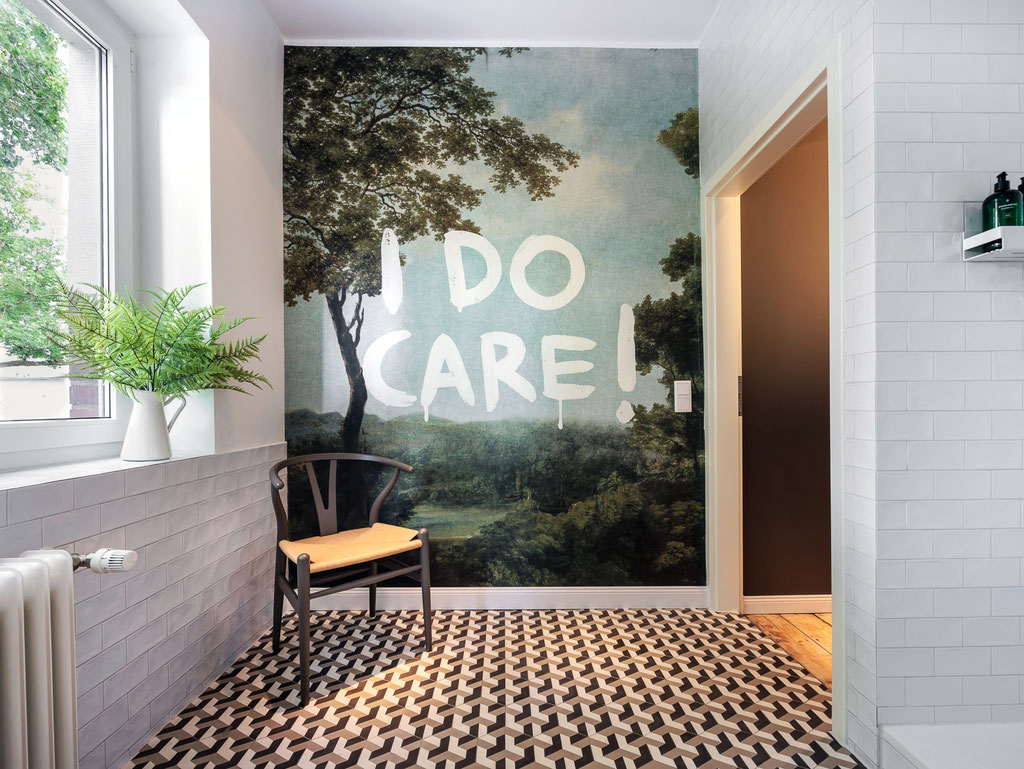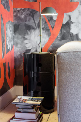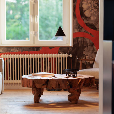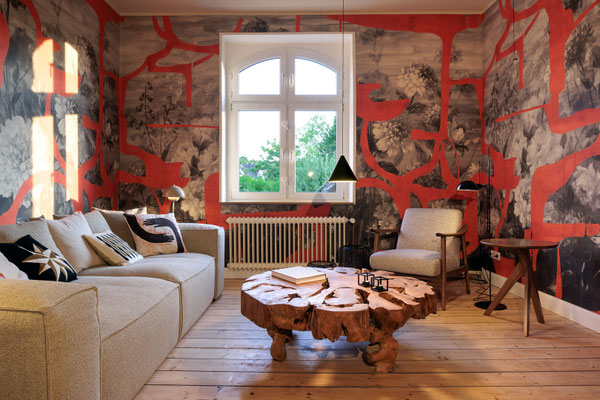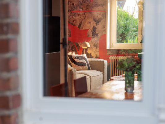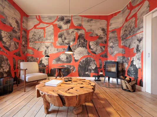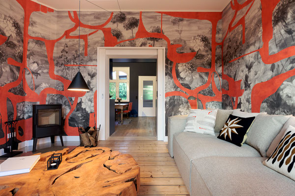 Im Wohnzimmer sorgt eine Mural-Tapete von Tres Tintas für einen kräftigen Farbkontrast. Das breite Bolia-Sofa lässt sich zu einem bequemen Gästebett ausziehen. Der gusseiserne Kaminofen schafft Wärme und Gemütlichkeit. Der Blick durch das Fenster geht in den Garten und den anliegenden Park.