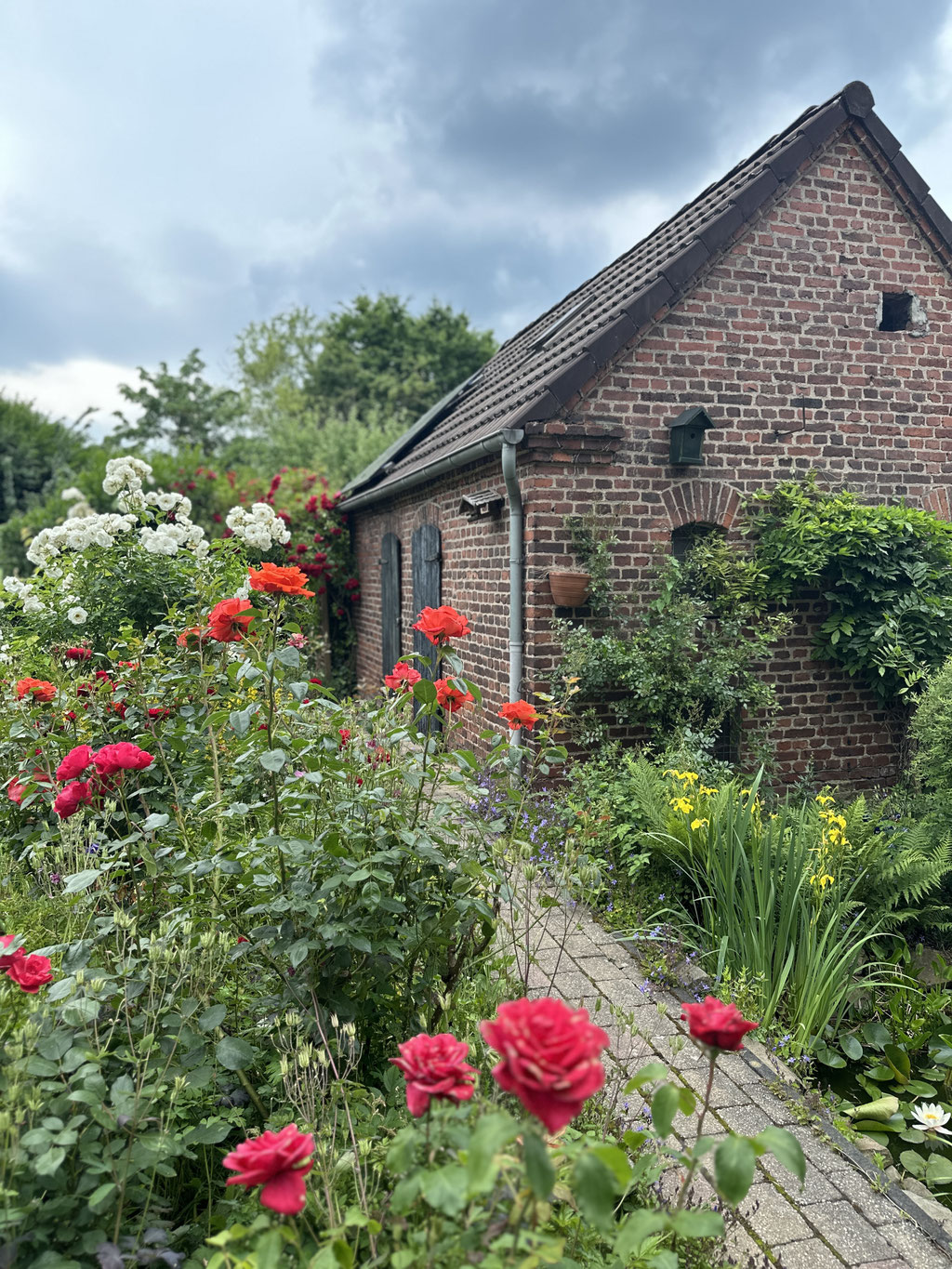 Durch diesen Bereich kommt man auch hinten auf die Terrasse und in den Garten. Unser Garten unterscheidet sich von den anderen dadurch, dass ein schmaler Weg entlang der Remise zu einem abgeschlossenen breiteren Gartenstück führt, das zum Verweilen und Entspannen unter alten Obstbäumen einlädt und von hohem Heckenbewuchs nach allen Seiten geschützt ist. Entlang des Weges steht eine Vielzahl von wunderbaren Rosenbüschen die unsere Vorbesitzerin gepflanzt hat.