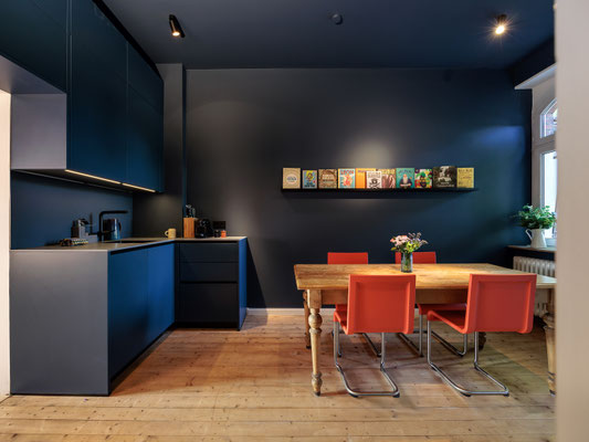 Die maßgeschneiderte Küche ist komplett in Blau gehalten.